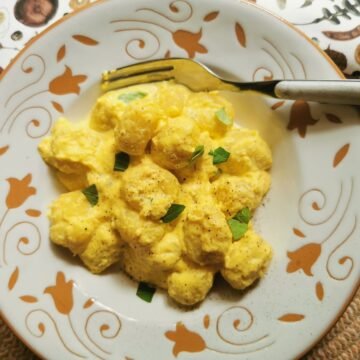 This delicious potato gnocchi with creamy saffron sauce is an easy to make Italian recipe from Umbria. Everything you need for the severe flavorful sauce is saffron (threads or powder), ricotta and milk. Potato gnocchi can be homemade or store -purchased. Perfect for weekdays and family meals.